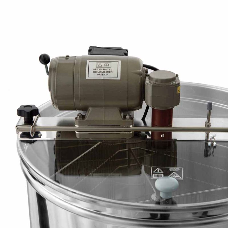 4-frame honey extractor with motor drive 110 W / 230 V and an integrated safety switch that automatically stops the motor when the lid is opened. State-of-the-art engineering allows an innovative design of the extractor tank bottom. The tank is seamlessly welded and angled toward the outlet. The stainless steel honey gate is welded at the lowest possible point so that all honey can drain from the extractor. Cleaning the extractor is easy. All parts that come into contact with honey are made from food-grade materials. The lid is fitted with special hinges and is made of transparent acrylic so you can observe the extraction process. The special foot construction ensures reliable stability of the extractor.