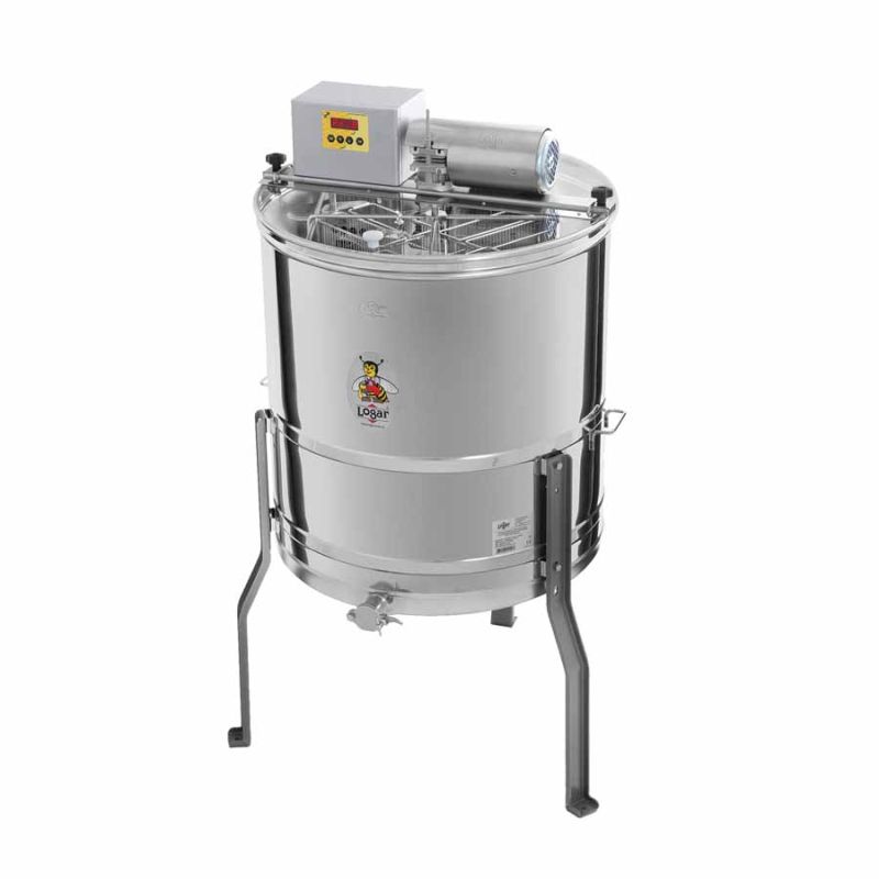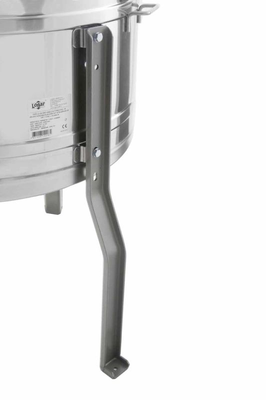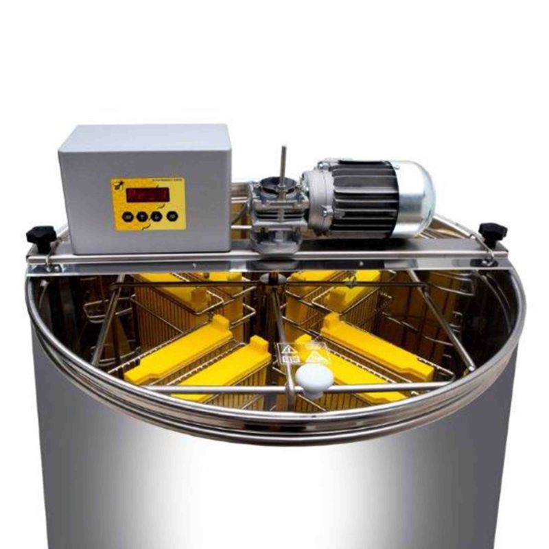 8-frame self-reversing honey extractor with 110 W / 230 V motor drive, fully automatic control and a safety switch that automatically stops the motor when the lid is opened. The honey pockets in the extractor are double; a sheet between them allows the honey to flow off. State-of-the-art engineering allowed us to develop an innovative extractor bottom. The tank bottom is seamless-welded and inclined toward the outlet. The stainless squeeze tap is welded at the lowest possible point so that all honey can flow out of the extractor. All parts that come into contact with honey are made of food-grade materials. The lid is made of transparent acrylic. A special stand design gives the extractor excellent stability.