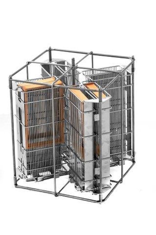 The frame pockets are made from vertical grid rods of appropriate density to prevent damage to the frames during spinning. They are connected to each other by a special mechanism. The pockets prevent honey from pooling inside them during extraction, so the frames are dry after spinning.